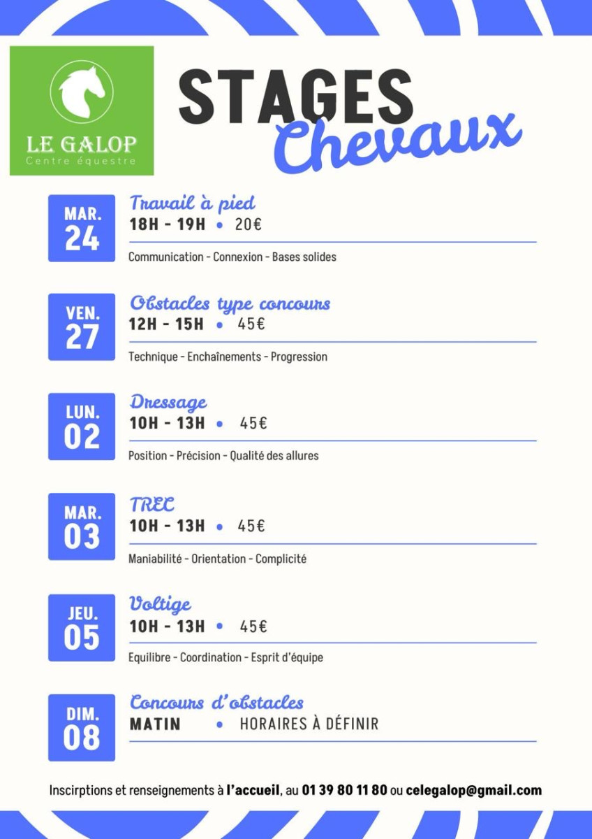 - Vendredi 27 Février 12 h à 15 h : Obstacles type concours (45 euros)
